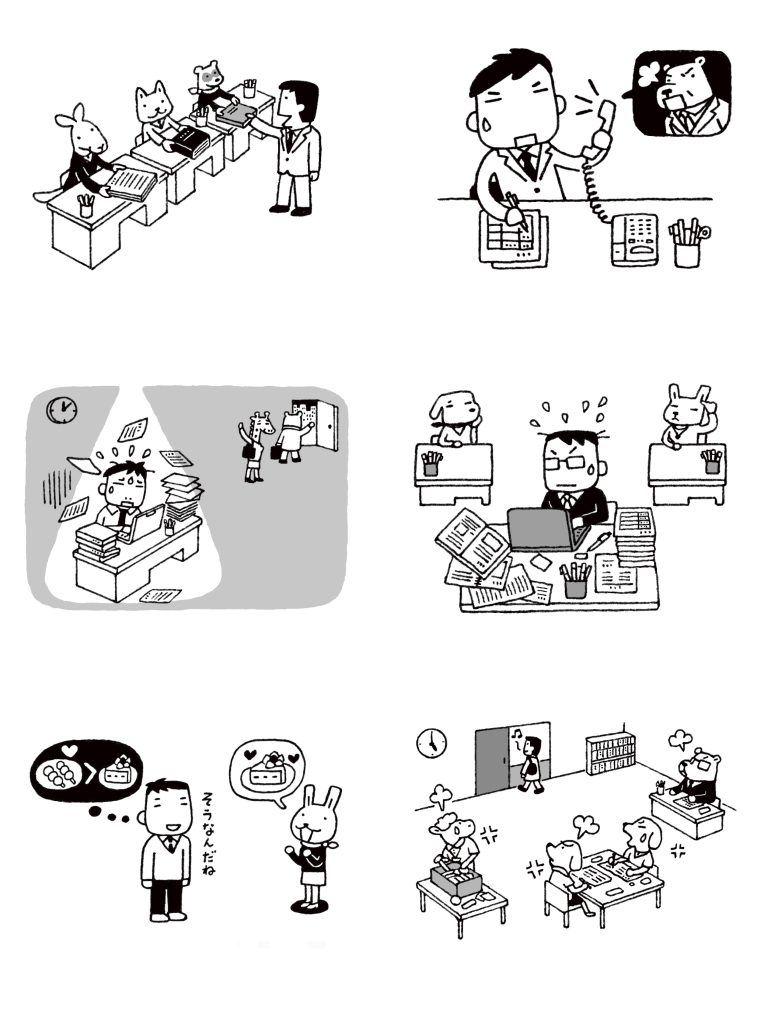 自分では一生懸命にやっているのに、なぜか周りの評価が低いと感じている人物は人間で表現し、職場の人々は動物に変えてくださいというご依頼で描きました。