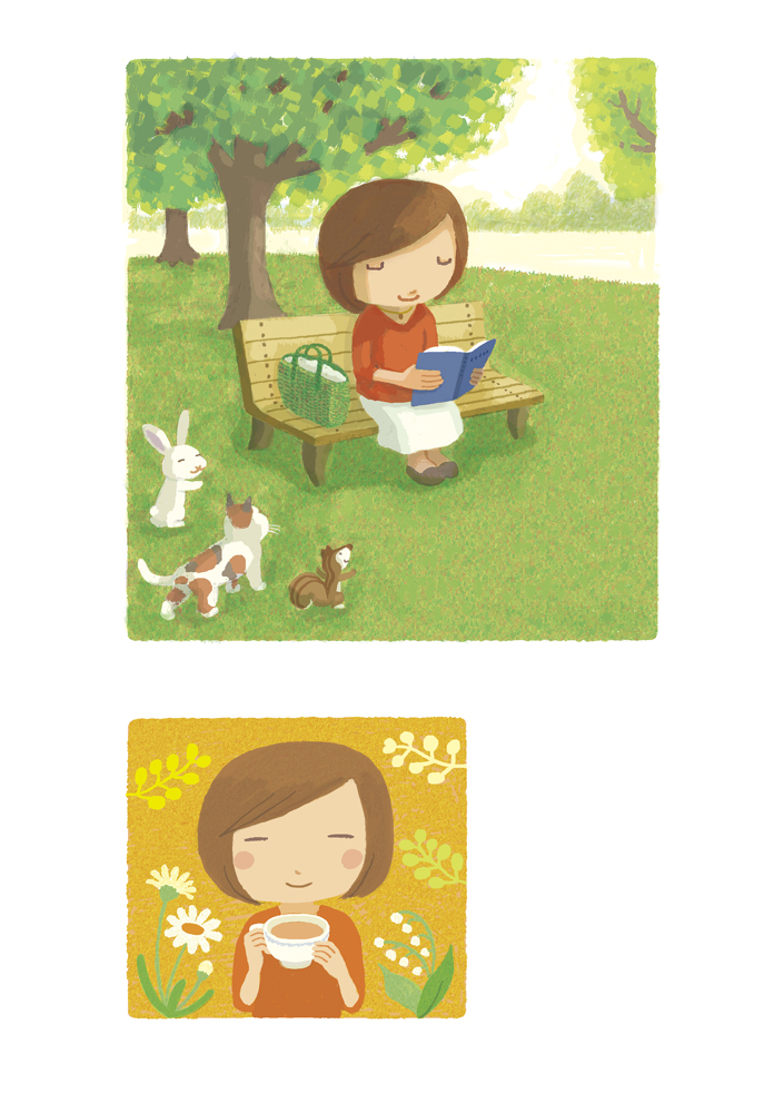 公園で読書をしている女性のところに動物たちが近づいて様子を見ているのどかなシーンを描きました。